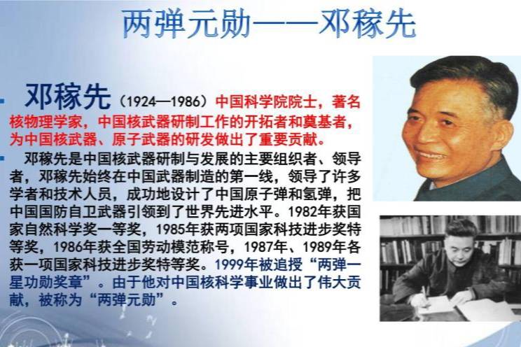 邓稼先,我国著名的核物理学家,被誉为“中国原子弹之父”,他的一生致力于国家国防科技事业,为我国的核武器研究和制造做出了卓越的贡献,接下来让我们一起走进邓稼先的英雄事迹,感受他无私奉献、献身国防的崇高精神。