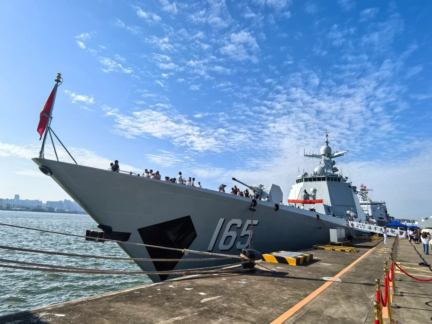 1、湛江舰全貌:高大的舰体、威严的舰首,展示出中国海军的雄壮气势。