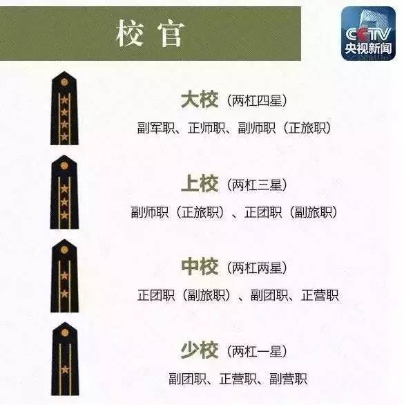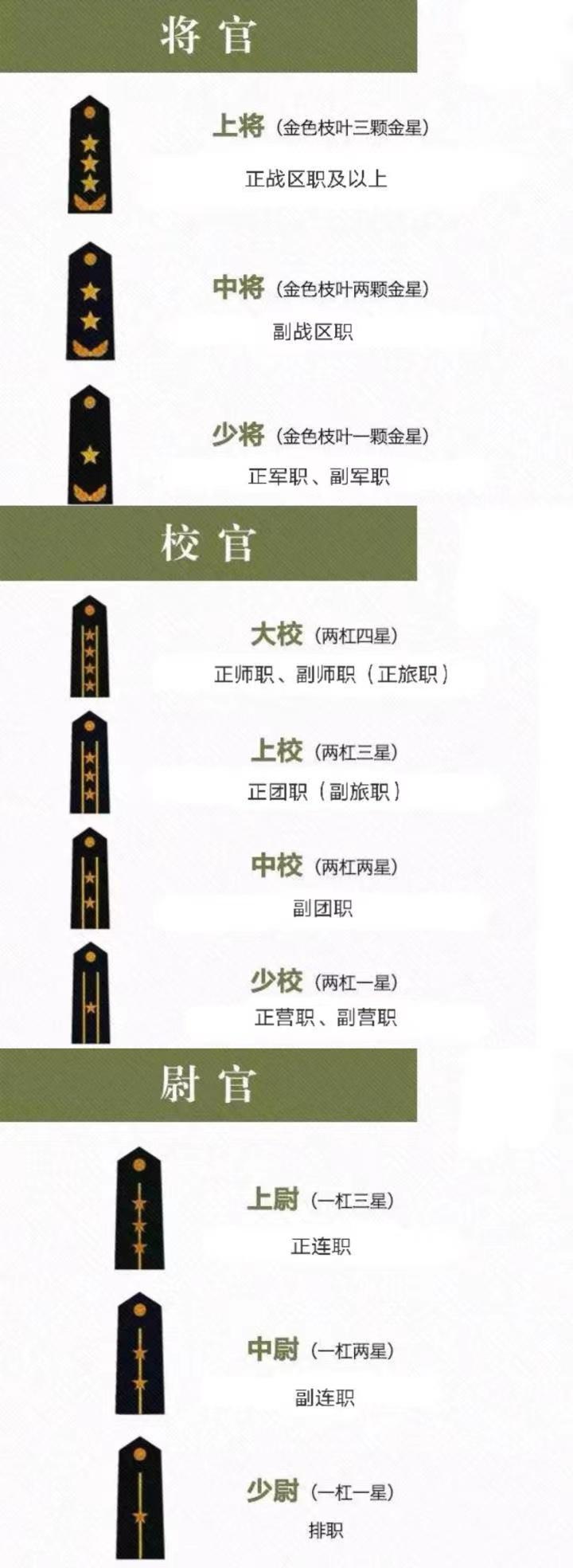 中国军官军衔包括尉官、校官、将官三个等级,尉官包括少尉、中尉和上尉;校官包括少校、中校、上校和大校;将官包括少将、中将和上将。
