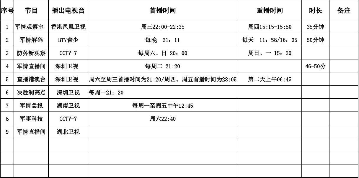 国防军事电视节目表是电视观众获取军事信息的重要渠道之一,在当今社会,国防军事安全是国家安全的重要组成部分,军事信息的传递和普及显得尤为重要,通过国防军事电视节目表,观众可以了解到国内外的军事动态、军事科技进展、国防建设等方面的信息,增强国防意识,提高国家安全意识。