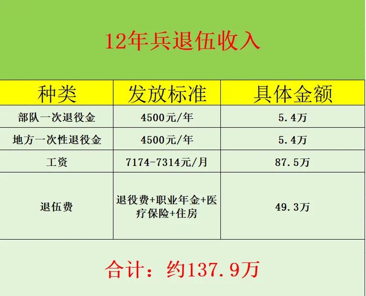 本文仅对海军服役12年的退伍费进行了简要介绍,具体金额和政策可能因时间和地区的不同而有所变化,如果您是海军退役士兵或家属,建议咨询当地相关部门或机构,以获取最准确的信息和帮助。